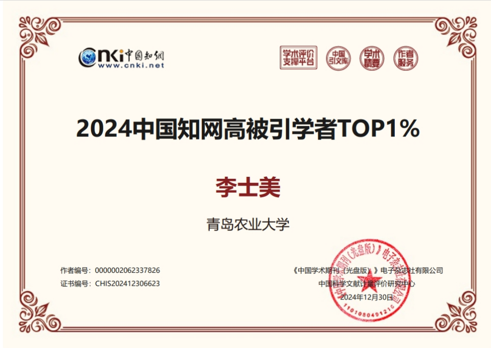 中国知网中国科学文献计量评价研究中心基于中国知网收录的10年(2014-2023)国内学术成果计算每位学者的单篇论文引证标准化指数(Paper Citation Standardized Index,简称 PCSI),2024年首次开展学者学术影响力客观评价,遴选了“2024中国知网高被引学者”名单,助力优秀成果的国内首发。tyc234cc太阳成集团教师李士美入选“2024中国知网高被引学者TOP1%”名单。据获悉,2024年全国约335万名作者进入初选。“2024中国知网高被引学者TOP1%”需满足:近十年发文的作者总PCSI位于初选作者范围的TOP1%,且近十年发表PCSI高于理论平均值(1.65)的论文不少于5篇以及近十年至少发表1篇高影响力论文。2024中国知网高被引学者名单详见https://xs.cnki.net/List/HCS_List。