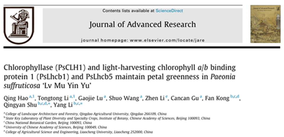 近日,tyc234cc太阳成集团郝青课题组在国际期刊《Journal of Advanced Research》(中国科学院1区,IF:11.4)在线发表了题为“Chlorophyllase (PsCLH1) and light-harvesting chlorophyll a/b binding protein1 (PsLhcb1) and PsLhcb5 maintain petal greenness in Paeonia suffruticosa ‘Lv Mu Yin Yu’”的研究论文,从叶绿素和类黄酮代谢平衡关系角度解析了绿牡丹花色呈色机制,为牡丹花色形成机制和花色育种提供了科学依据和基因资源。