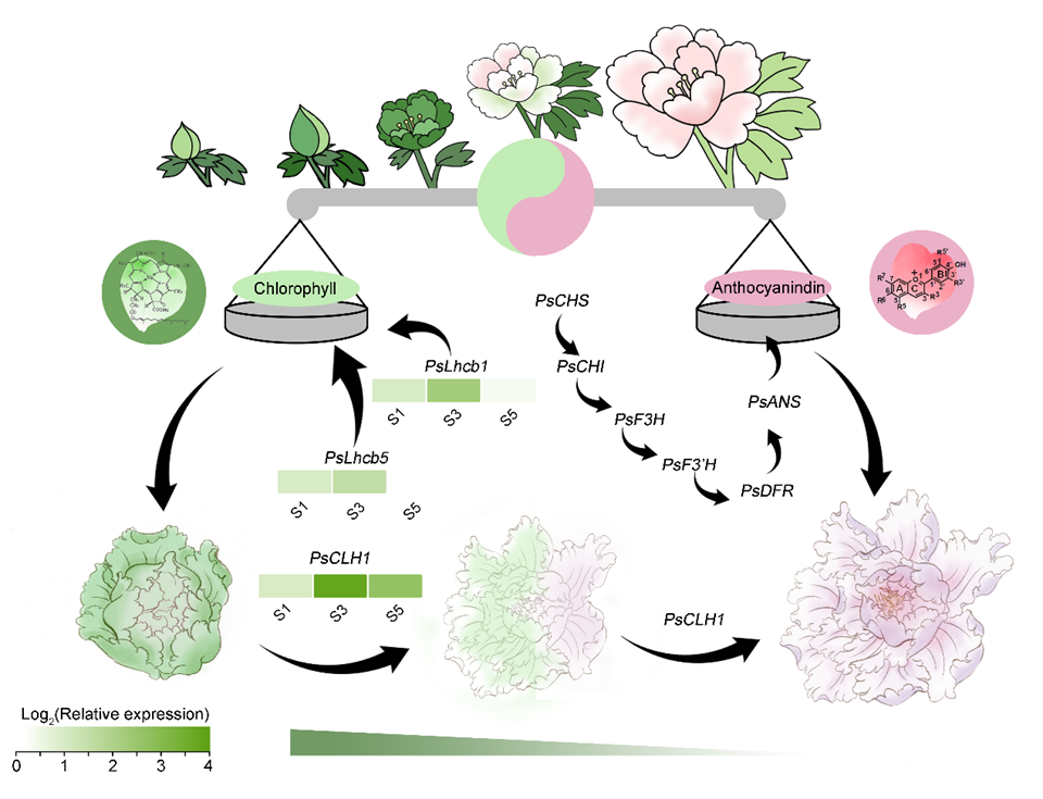 花是被子植物重要的繁殖器官,以花为基础的传粉者吸引机制是植物进化史上最具有适应意义的机制之一。为了吸引蜜蜂、蝴蝶或鸟类等传粉者,植物进化出了各种颜色的花,其中具有绿色花并不是一种自然界常见的适应性状,因为对于昆虫等传粉者的视觉系统,绿色花和绿叶的反射光谱难以区分,导致拥有绿色花的植物在自然界中十分罕见。然而,绿色花却很受市场和消费者的欢迎。菊花、月季、马蹄莲等为数不多的物种已培育出了稀缺的绿色花品种,然而,目前对于绿色花的花色呈色机制研究尚显不足。牡丹(Paeonia suffruticosa)花大色艳、雍容华贵,在漫长的栽培驯化和品种选育过程中,形成了白、红、紫、黑、蓝、黄、粉、绿和复色九大色系,其中绿色系品种具有独特的美感和珍稀性,开花过程中花瓣颜色由绿色转变为粉色或白色,是研究叶绿素和类黄酮代谢平衡关系模式系统的优良材料,具有较高的科研与商业价值。
