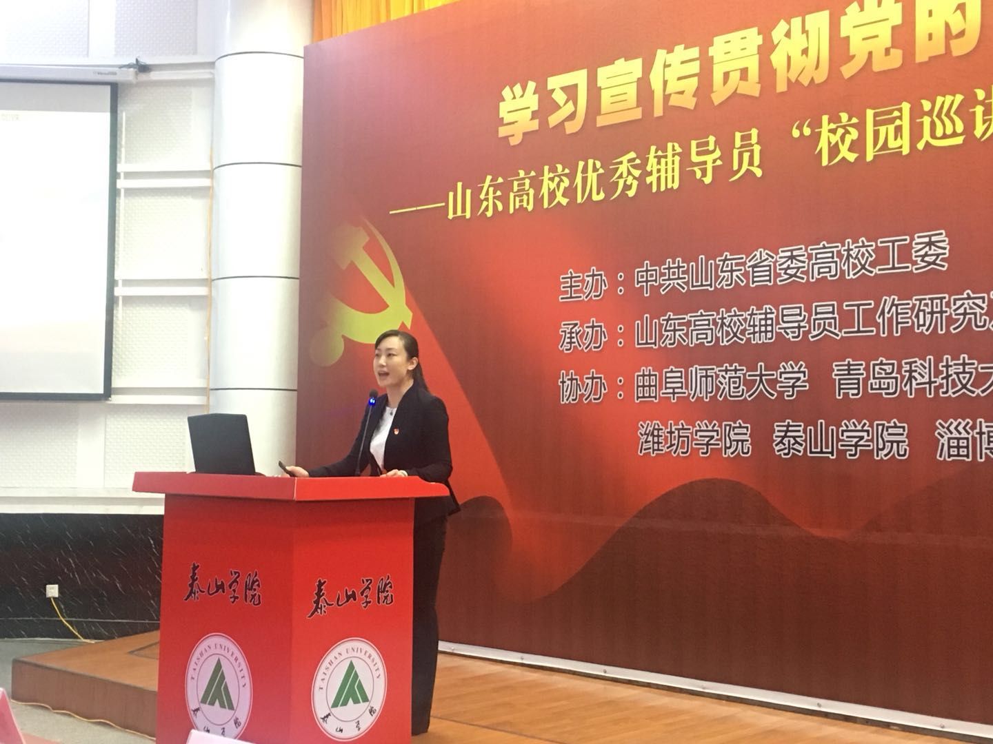 12月14日下午,由中共山东省委高校工委主办的“学习宣传贯彻党的十九大精神——山东高校优秀辅导员‘校园巡讲’和‘网络巡礼’活动”在泰山学院举行。第八届山东高校十佳辅导员、tyc234cc太阳成集团辅导员孙贝贝作为山东高校优秀辅导员学习宣传贯彻党的十九大精神校园巡讲团成员,作了题为《理解党建新篇章 吹响前进新号角》的主题宣讲。整个宣讲过程中,孙贝贝引经据典,列举了大量鲜活实例与工作案例,从全面从严治党的角度生动解读了党的十九大报告,现场反响热烈,有效推动了十九大精神在高校的学习宣传贯彻,推动了党的十九大精神入脑入心。