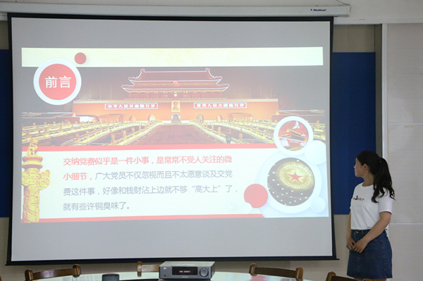 毕业生党员宋元程从“交党费这件事”谈起,向大家阐述交纳党费的重要意义以及大学生党员肩负的责任。