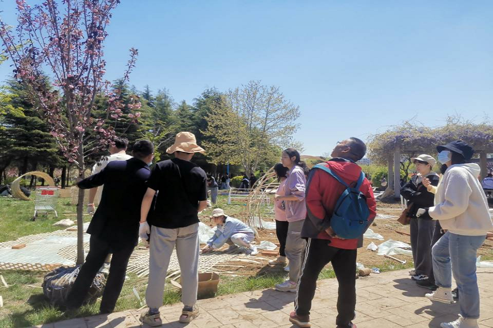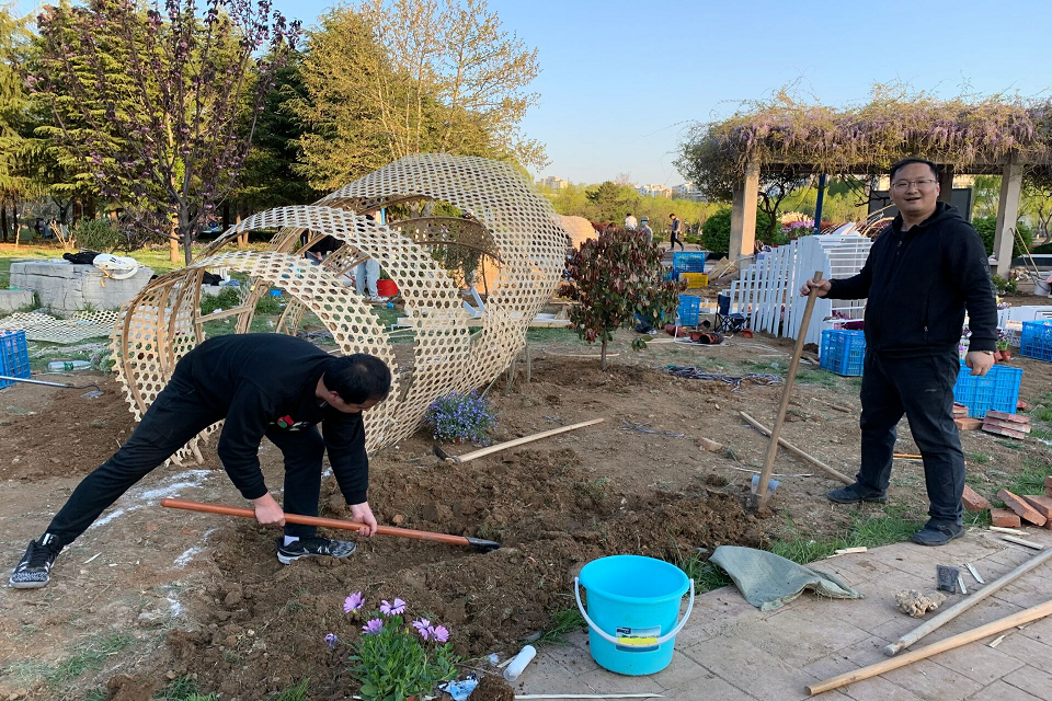 场地布置开始前,学院挑选了部分同学的优秀作品,对其作品的设计不断推敲并进行材料的准备,力争将其最好的一面展现在大家面前。活动进行时,学院的展园制作小组成员为展现出自己作品最好的效果,积极投入创作,义工同学们也积极参与,相互配合,帮助同学们完成构筑物的搭建和各种花卉的种植,校园里洋溢着花朵的芳香。学院教师也与学生共同参与了此次活动,活动过程中,师生合作密切,认真交流活动方案,致力于打造精美展园,期间,学院老师们也纷纷也加入到展园的布置行列中,与同学们一同完成展园的搭建,师生共同努力,形成了一道靓丽的风景线。