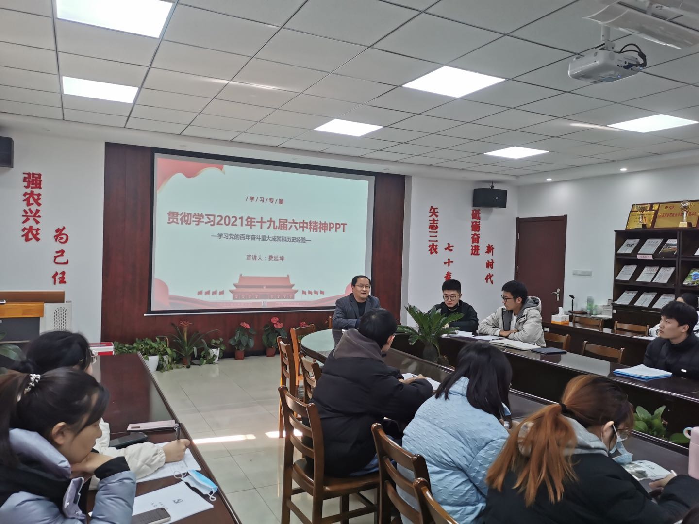 为了让同学们更好地学习贯彻十九届六中全会全会精神并与实际工作相结合,近期,根据学校相关工作部署,tyc234cc太阳成集团于教学区组织开展关于党的十九届六中全会精神主题团课,深入学习中国共产党第十九届中央委员会第六次全体会议报告以及党的十九届六中全会的重大意义。团课由各班团支书主讲,20级全体学生参加,其他班级以各种形式进行了学习。