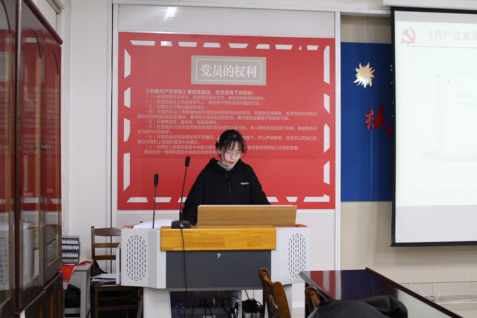 会上,吕玥首先从中国共产党发展史中得到的启示展开,并讲述了中国道路的独到之处。她表示作为党员应充分认识开展党史学习教育的重要意义,要始终牢记自己身为党员的使命,学习马克思主义,用党的创新理论武装头脑,坚持以人民为中心的发展思想,全心全意为人民服务。她强调,祖国一天比一天强大,一天比一天繁荣,这离不开中国共产党的领导,作为党员更要起到模范先锋作用。会上,吕玥提出了作为党员需要“慎独、坚定理想信念、守住底线、提高境界、勇于担当”,还建议同学们多关注国家大事。宣讲中,各位学生党员认真做好记录。随后,学生党支部三名代表同学结合今日的党史学习发表了自己对党的一些看法以及自己将如何践行党员的责任与义务。