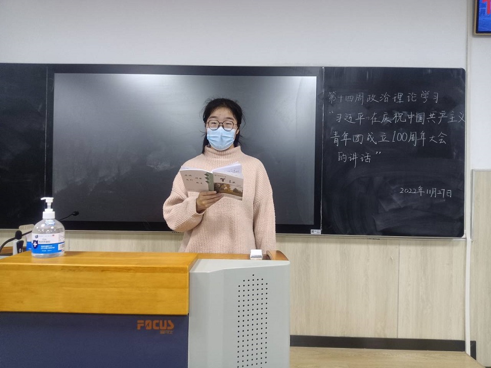 本次政治理论学习内容为习近平在庆祝中国共产主义青年团成立100周年大会上的讲话。各班团支书讲述习近平主席的讲话内容,明确青年命运与时代紧密相连的核心,以及习近平主席对青年提出的四点希望。随后,各班团支书结合习近平主席的讲话与同学们一起探讨如何提升自我以更好的为国家发展献言献策,并向同学们发出倡议,希望在接下来的日常生活和学习中同学们能够脚踏实地、艰苦奋斗、全面发展,为祖国建设贡献青春,推动中华民族勇毅前行。