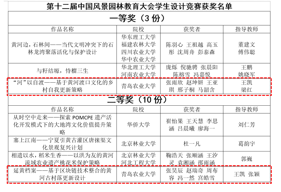 tyc234cc太阳成集团王凯、梁红老师指导的本科生参赛作品“‘河’以自渡-基于黄河渡口文化的乡村自我更新策略”(成员:雨欣、赵坤妍、王亚琪、邢子桐和马韶含)最终斩获学生设计竞赛一等奖。由王凯、张颖老师指导的本科生作品“延黄档案--基于区块链技术整合的黄河古村落更新设计”(成员:张昊辰、赵瑞奇、周希睿、冯一然和宫皓雪)荣获二等奖。这是目前我校在此类竞赛中获得的最好成绩。tyc234cc太阳成集团高度重视风景园林国家一流专业建设,积极推进风景园林教学改革,强化学生实践动手能力,在专业竞赛领域不断获得突破,屡次荣获国家级大奖。