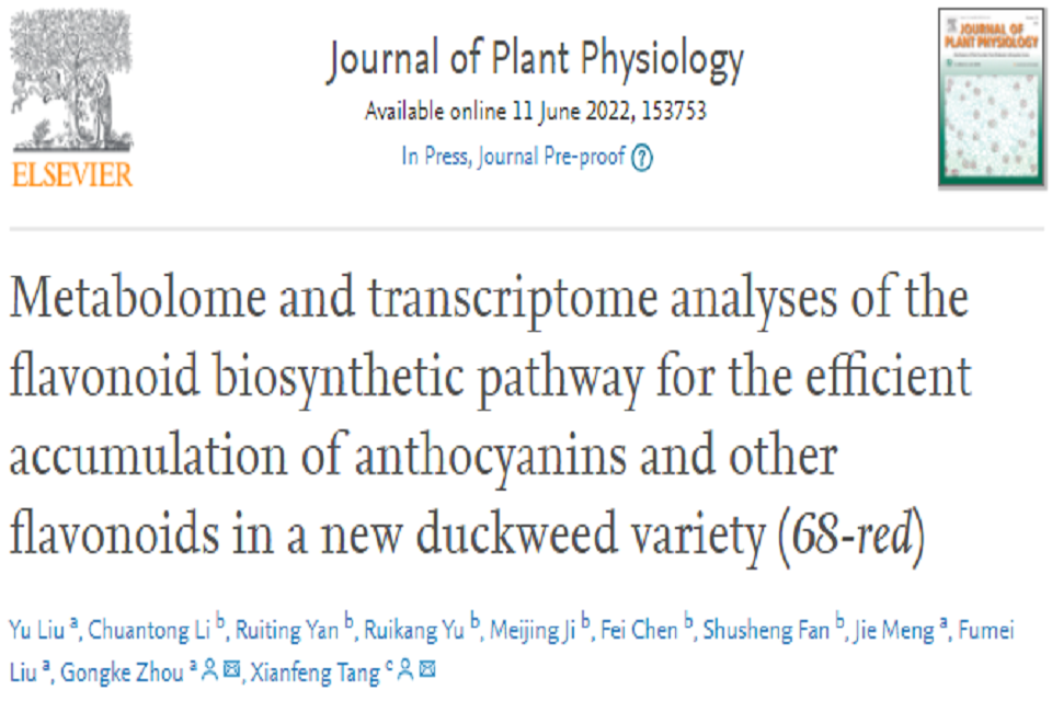 近日,tyc234cc太阳成集团周功克教授团队在Journal of Plant Physiology(中科院2区,IF:3.549)期刊上在线发表了“Metabolome integrated with transcriptome reveal the molecular mechanism of efficient accumulation of flavonoids in a new duckweed variety (68-red)”的研究论文。