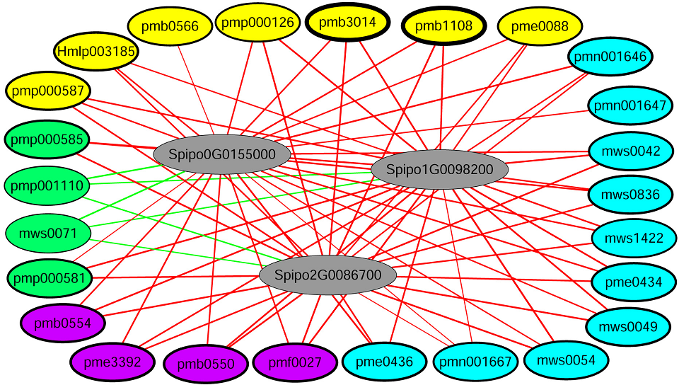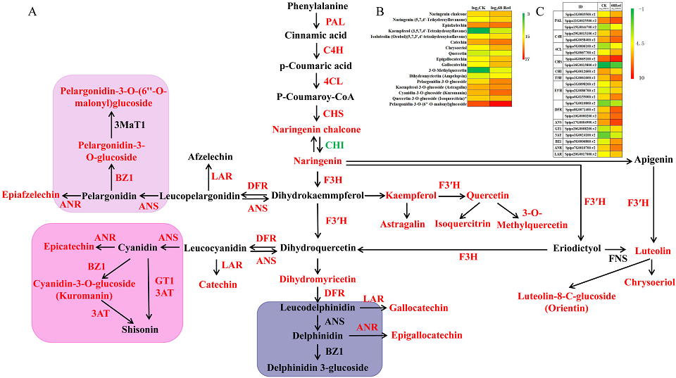 在该研究中,团队利用重离子辐射诱变获得浮萍突变体库,经过大量筛选获得一株黄酮含量高且叶状体背面呈现深红色的突变体,我们将其命名为68-red。与野生型紫萍相比,该突变体的花青苷和原花色素含量分别增加5.63倍和2.32倍,荭草苷(luteolin-8-C-glucoside)和青兰苷(luteolin-7-O-glucoside)含量分别增加53.82%和41.31%。利用代谢组分析发现734个代谢物,其中251个代谢物差异积累,特别是矢车菊素-3-O-葡萄糖苷、矢车菊素-3-O-半乳糖苷、天竺葵素-3-O葡萄糖苷和天竺葵素-3-O-(6''-O-丙二酰)葡萄糖苷呈现显著积累,且低聚原花色素(B1, B2, B3, B4, C1, C2)和黄酮糖苷(11个木犀草素及其糖苷,14个槲皮素及其糖苷,14个山奈酚及其糖苷和2个芹菜素糖苷)也大量积累。进一步分析发现黄酮代谢途径中16个酶基因显著上调表达,而查尔酮异构酶基因(CHI)则显著下调表达。转录组和代谢组联合分析发现,三个类黄酮3'-羟化酶基因(Spipo0G0155000, Spipo2G0086700,Spipo1G0098200)分别与224,238和237个差异代谢物关联,其中包括矢车菊素糖苷,天竺葵素糖苷,低聚原花色素和黄酮糖苷,提出类黄酮3'-羟化酶基因可能是导致突变体高效积累类黄酮的关键因素,为未来利用浮萍高效合成类黄酮化合物提供了重要的功能元件。此外,在本研究中并没有检测到黄酮3'5'-羟化酶基因(F3'5'H)和飞燕草素糖苷,推测紫萍中并不存在飞燕草素合成途径。