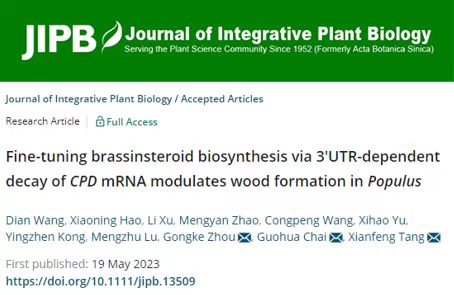 近日,JIPB 在线发表了tyc234cc太阳成集团周功克课题组题为“Fine-tuning brassinsteroid biosynthesis via 3’UTR-dependent decay of CPD mRNA modulates wood formation in Populus”的研究论文。该研究发现杨树中RNA结合蛋白PdGRP1能够结合BR合成基因PdCPD1的3’ UTR区富含GU的元件并介导其降解,进而调控BR的合成来影响杨树木材的发育。