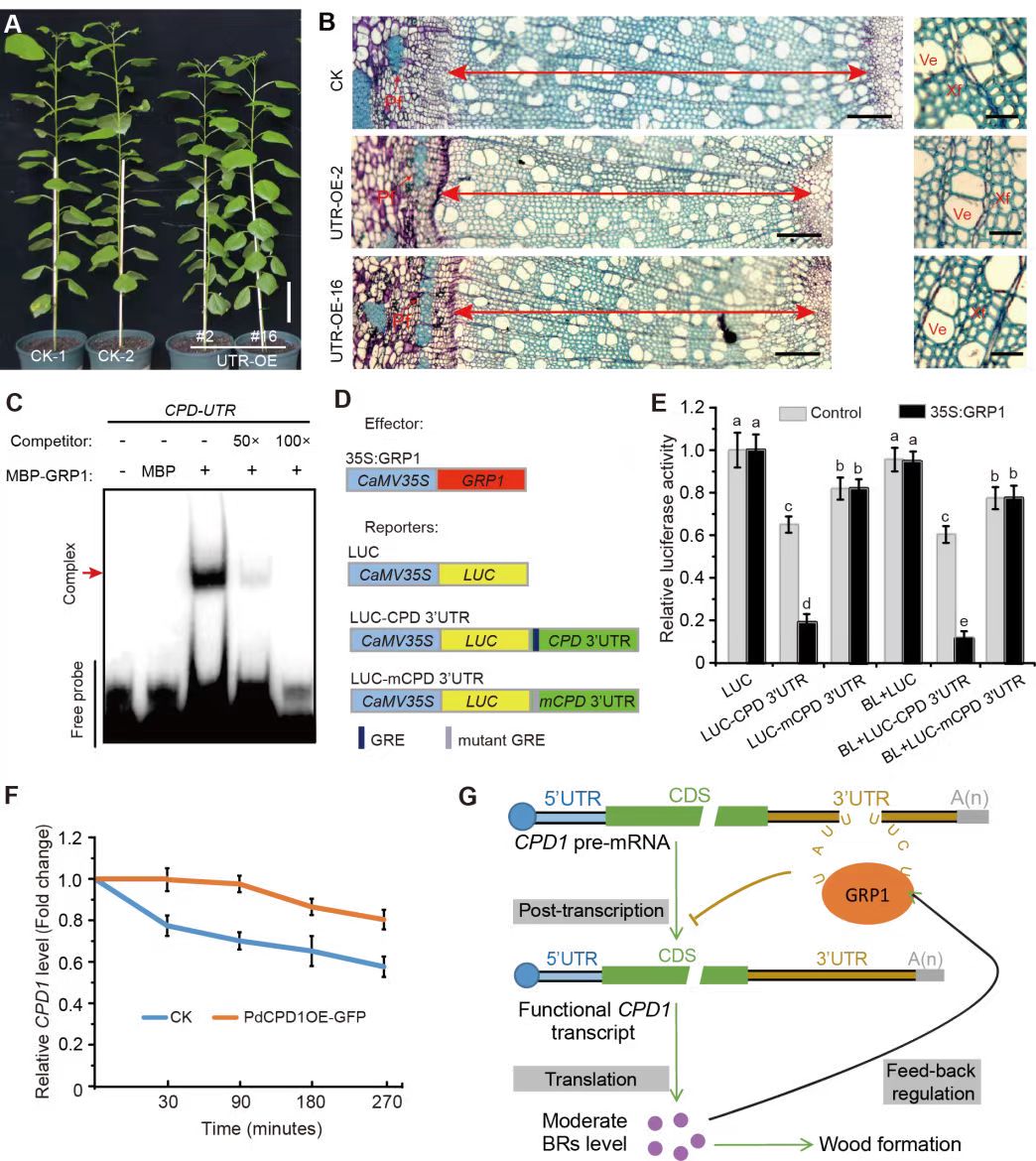 周功克课题组研究发现低浓度的BR处理杨树‘南林895’能够显著促进其生长,而提高外源BR浓度后能够抑制其生长甚至致死。在‘南林895’中过表达BR合成基因PdCPD1后导致茎中BR浓度显著升高,但过高的BR含量抑制了木质部的发育,对PdCPD1的CDS区进行RNAi后导致茎中BR含量显著降低也抑制了木质部的发育。而在对PdCPD1的3’ UTR区域进行RNAi后CPD1的表达量上调了2-3倍,BR的含量也略有升高,进而促进了木质部的发育。进一步研究发现该区域含有富含GC的调控元件,而且能够被RNA结合蛋白PdGRP1结合并介导其降解。在杨树中过量表达该UTR区段能够竞争结合PdGRP1进而减弱了PdGRP1参与的PdCPD1的mRNA的降解过程,最终提高PdCPD1的转录水平。因此该研究揭示了杨树BR合成的转录后调控机制,同时也揭示了BR合成调控在杨树木材发育中的作用机理。