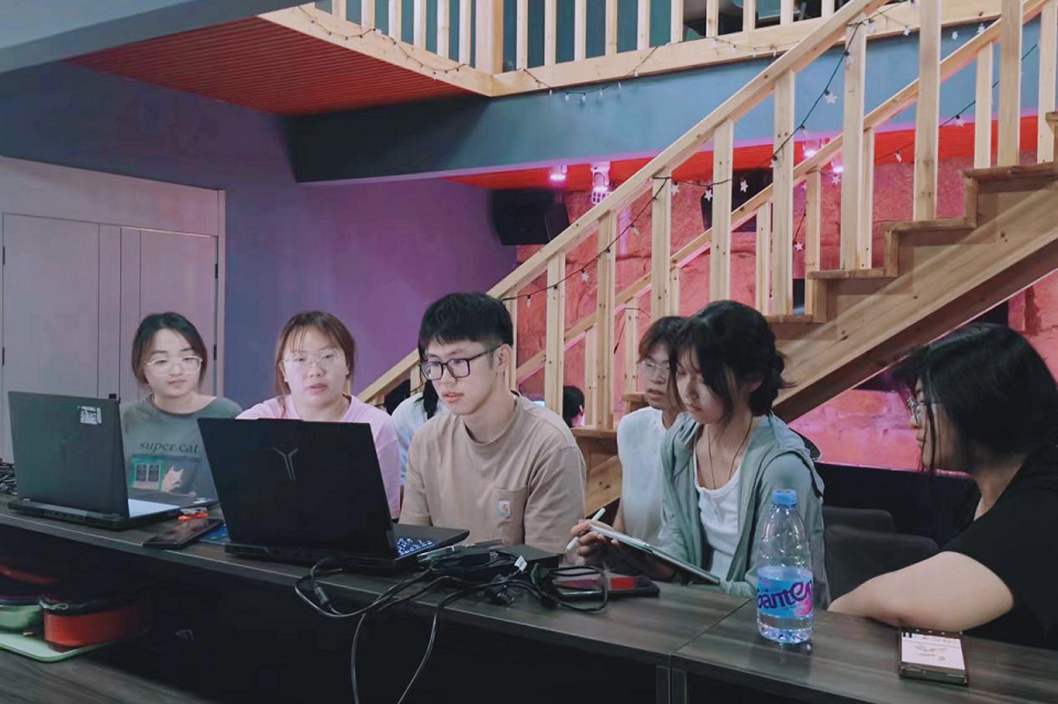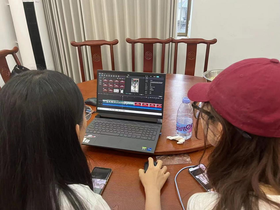 团队成员在下湖村开展调研,队员进行视频剪辑