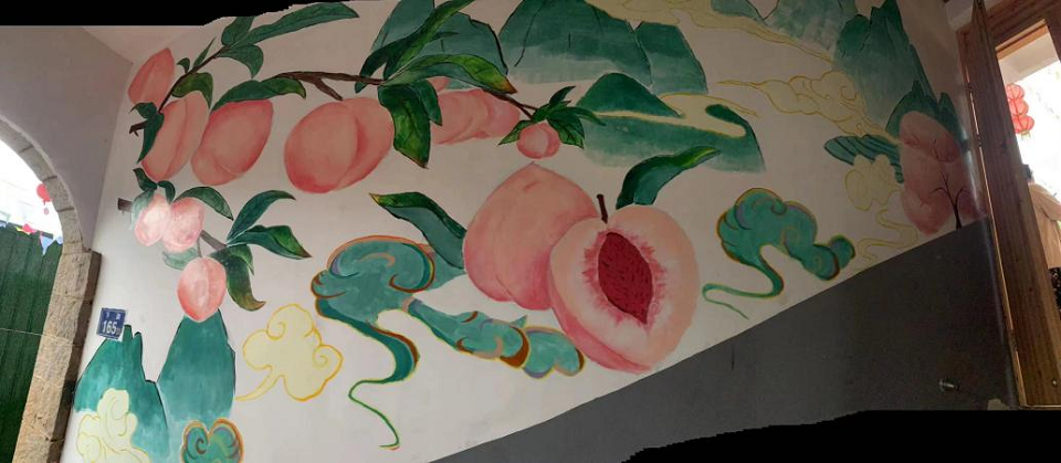 在之后的两天里,队员们齐心协力,相互配合。调颜色、添颜料、清洗画笔等一道道工序有序运行,画笔在墙面上跳跃,一个个桃子、一座座青山便显现出来,与周围环境结合在一起,形成下湖村的一道亮丽的风景线。墙绘宣传乡村文化,不仅改善了乡村面貌,也将绘画艺术融入到了乡村生活中。