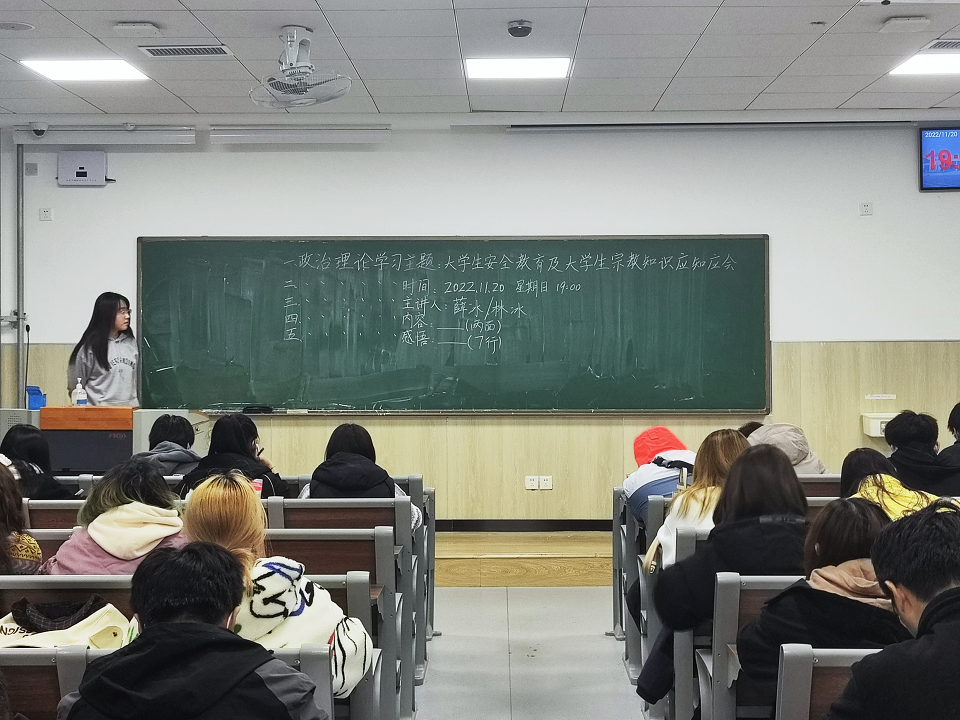 为提高安全意识,保证大学生的健康成长,11月20日,tyc234cc太阳成集团于教学区开展“大学生安全教育及大学生宗教知识应知应会”政治理论学习。本次学习由各班团支书主持,21级、22级全体同学分别于城阳校区、平度校区参加。