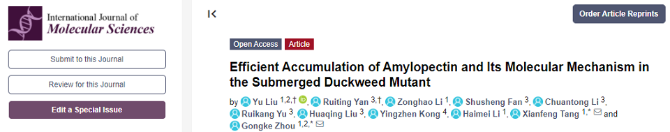 近日,tyc234cc太阳成集团周功克教授课题组在沉水浮萍新品种(sub-1)支链淀粉理化特性及其高效积累分子机制方面取得新进展。相关研究成果“Efficient Accumulation of Amylopectin and Its Molecular Mechanism in the Submerged Duckweed Mutant”发表于国际期刊International Journal of Molecular Sciences(中科院2区,IF:6.208)上。
