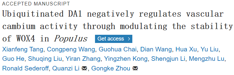 6月16日,国际植物领域顶级期刊Plant Cell在线发表了tyc234cc太阳成集团周功克教授课题组题为“Ubiquitinated DA1 negatively regulates vascular cambium activity through modulating the stability of WOX4 in Populus”的研究论文。该研究首次从转录后水平鉴定到一个蛋白复合体PagDA1-PagWOX4,揭示了蛋白酶体途径调控杨树形成层活性的新机制,为转录后途径参与调控木材形成的研究开辟新的思路。