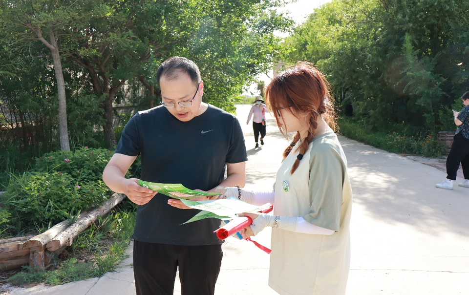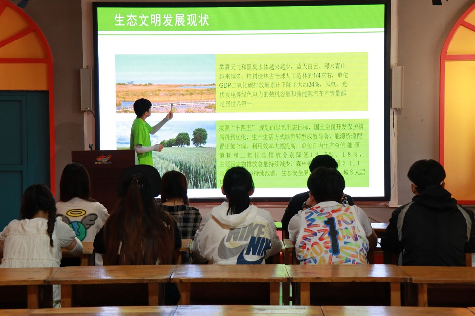 实践服务团共计开展宣讲活动十余场,旨在加强当地人民和游客对黄河三角洲生态保护的认知,普及生态文明的价值理念,围绕绿色发展和低碳生活提出在日常生活中切实可行的建议。团队在知青小镇围绕“共建生态文明,推动绿色发展”开展宣讲会,“绿色发展是顺应自然、促进人与自然和谐共生的发展,是用最少资源环境代价取得最大经济社会效益的发展,是高质量、可持续的发展。”宣讲员围绕绿色发展理念、生态文明思想和相关重要政策措施等内容展开生动的讲解,现场通过展示播放图片、讲述实际案例以及环境保护小知识现场互动问答等活跃宣讲现场气氛,鼓励村民从自身做起,不乱排污水、合理使用农药化肥等,积极参与到绿色环保、低碳生活的行动中来,养成绿色、低碳、循环、可持续的生产生活方式。